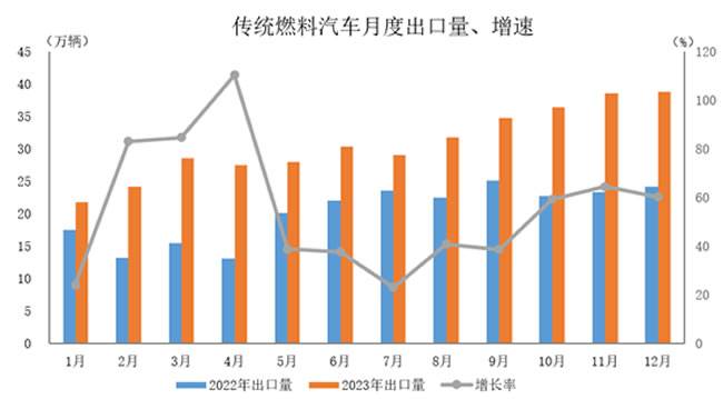 2023年12月,传统燃料汽车出口38.8万辆,环比增长0.5%,同比增长60.3%。 2023年,传统燃料汽车出口370.7万辆,同比增长52.4%。