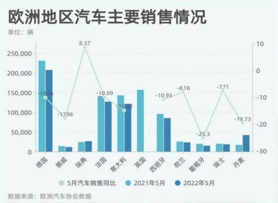 Mosen用两组数据给我们解释了欧洲汽车后市场现状。首先是新车销售量下滑,据欧洲汽车协会数据显示,欧洲大部分国家的新车销售量都处于一个下滑的趋势,其中电动乘用车销售自2022年初开始停滞不前,德国、法国、意大利和西班牙的电动汽车占比均较低,分别为14%、9%、5%、3%。