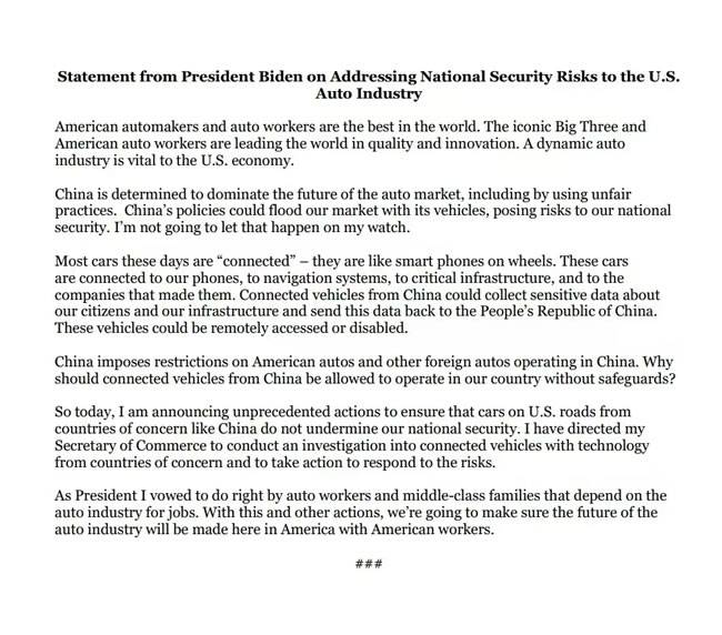 拜登总统关于应对美国汽车业面临的国家安全风险的声明;图片来源:美国政府官网