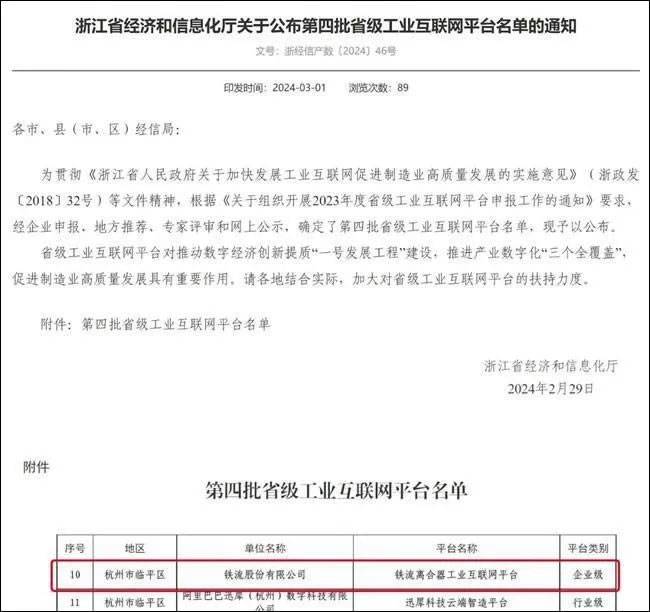 6、铁流股份入选2023年度省级工业互联网平台