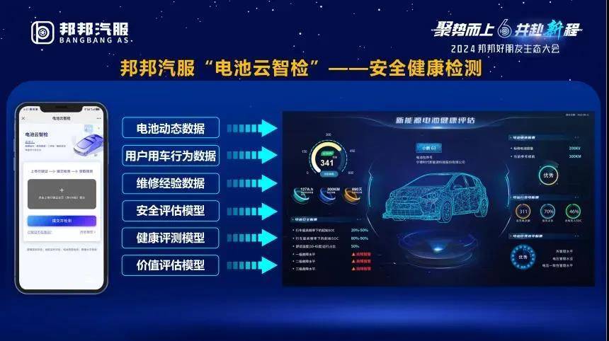 据悉,邦邦汽服正加速在新能源汽后服务生态的探索与布局,并已通过保险、汽配与维修资源的深度连接,逐步构建起包括延保服务、动力电池安全健康检测、查勘检测、理赔风控、配件供应、新能源维修、残值检测与估值回收等在内的线上+线下一体化服务体系。