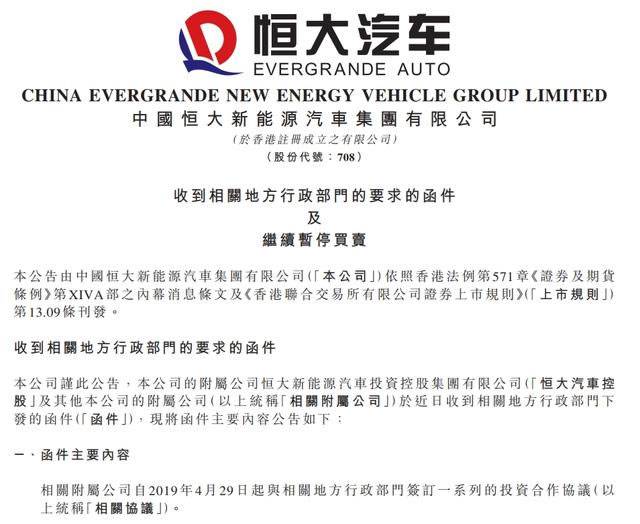 5月22日晚间,恒大汽车(HK0708,股价0.38港元,市值41.21亿港元)在港交所公告,公司的附属公司恒大新能源汽车投资控股集团有限公司(“恒大汽车控股”及其他本公司的附属公司,以下统称“相关附属公司”)于近日收到相关地方行政部门下发的函件。