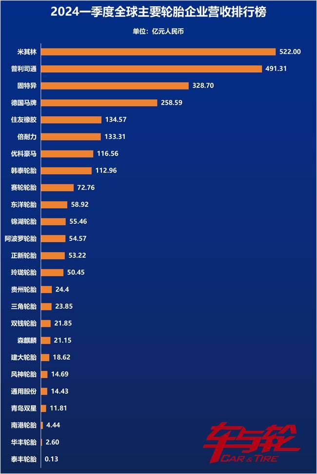 从营收来看,排行榜前几名并没有悬念,依然是国际轮胎巨头占据。