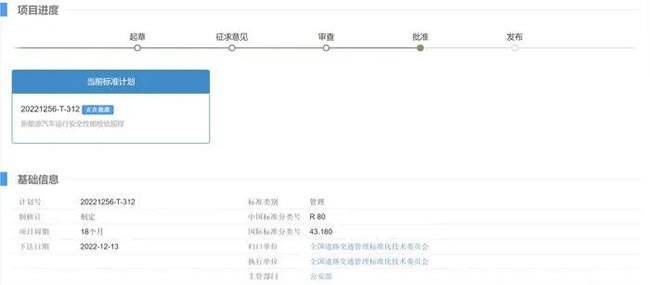 近日,由公安部交通管理科学研究所联合多家企业共同起草的《新能源汽车运行安全性能检测规程》相关标准项目成功抵达“批准”阶段。据全国标准信息公共服务平台,该标准计划号为20221256-T-312,显示“正在批准”。