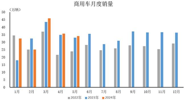 2024年5月,商用车产销分别完成32.1万辆和34.1万辆,环比分别下降10.1%和4.5%,产量同比下降0.2%、销量同比增长3.3%。