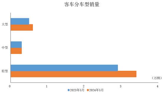 2024年5月,客车产销分别完成4.2万辆和4.3万辆,环比分别下降6.8%和4.8%,同比分别增长14.3%和16%。与上月相比,三大类客车品种产销均呈不同程度下降;与上年同期相比,大型客车和轻型客车产销均呈两位数增长,中型客车产量下降、销量增长。2024年1-5月,客车产销均完成20.1万辆,同比分别增长11.8%和15%。与上年同期相比,三大类客车品种产销均呈不同程度增长,其中大型客车和中型客车增速更为明显。