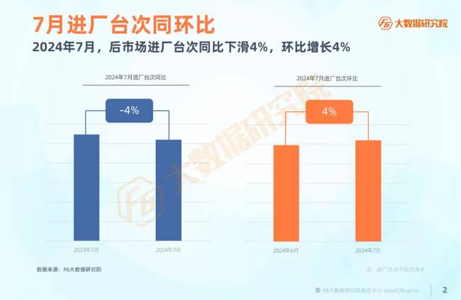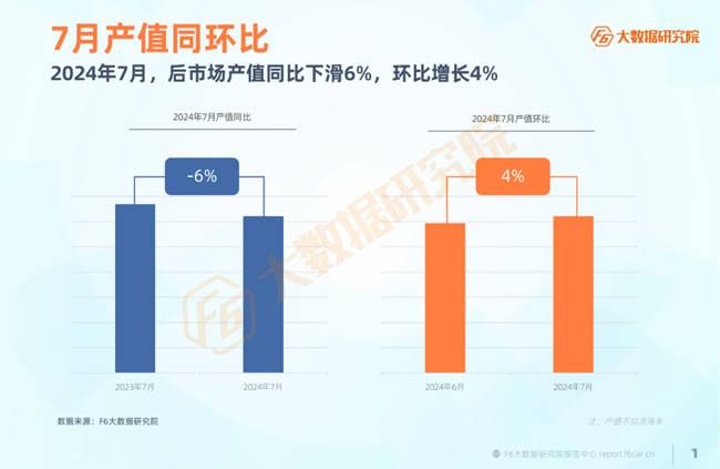 8月7日,据F6汽车科技数据显示,2024年7月,后市场产值同比下滑6%,环比增长4%。2024年7月,后市场进厂台次同比下滑4%,环比增长4%。