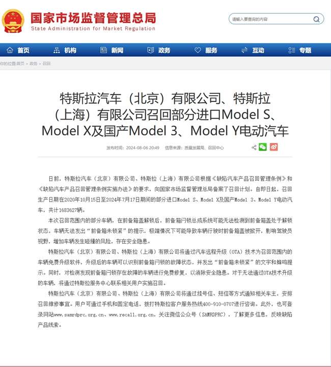 8月6日,国家市场监督管理总局发布最新召回公告。日前,特斯拉汽车(北京)有限公司、特斯拉(上海)有限公司向国家市场监督管理总局备案了召回计划。