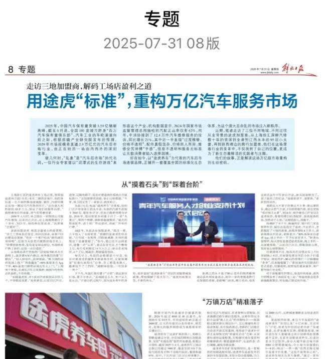7月31日,《解放日报》以《用途虎“标准”,重构万亿汽车服务市场》为题,刊发整版深度报道,系统梳理了途虎养车如何通过标准化体系,重塑汽车后市场的实践路径与行业价值。据专业机构预测,到2029年,中国汽车后市场规模将达2.9万亿元。面对行业中真假混杂、价格不透明、服务无标准等痛点,《解放日报》报道认为,途虎养车以“标准化”为核心,构建起覆盖全国的连锁服务网络,成为行业转型升级的标杆。为此,《解放日报》记者分别走访了上海、江西和陕西的三位途虎养车工场店加盟商,用实地调研验证途虎养车“标准化”体系在不同区域、不同背景创业者中的可复制性与盈利确定性。