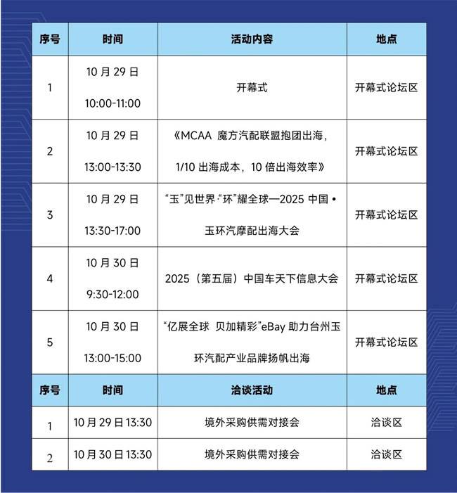 第二届中国(玉环)国际汽车零部件交易会将于2025年10月29日-31日在浙江·玉环会展中心(经开区)举行,为了能拥有更好的观展体验,我们整理了一份观展必读指南,让您用最轻松的方式开启本次观展之旅。