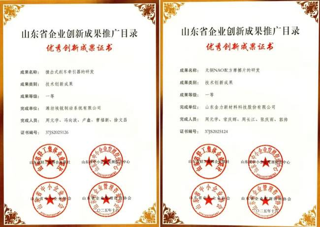 近日,山东省轻工集体企业联社、山东省中小企业发展促进中心、山东省中小企业协会、山东省企业管理咨询协会联合发布《关于公布2025年企业创新成果推广目录名单的通知》(鲁轻联企〔2025〕62号),集团旗下山东金力新材料科技股份有限公司完成的“无铜NAO配方摩擦片的研发”、潍坊埃锐制动系统有限公司完成的“撞击式刹车牵引器的研发”两项技术创新成果成功入选2025年山东省企业创新成果推广目录,并均被评定为一等技术创新成果。此次评选经企业申报、地市推荐、专家评审、社会公示等多轮程序严格遴选,两项成果同时获评一等,充分体现了集团在摩擦材料与房车领域持续创新的技术实力与研发水平,也是各级政府与行业权威机构对集团科技创新工作的再次肯定。