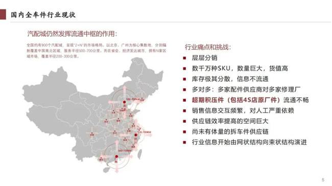 当前,中国汽配行业仍以汽配城为流通中枢,全国约900个汽配城形成“2+N”格局——北京、广州作为南北核心集散地,服务半径达500-700公里;省会及经济发达城市的N家区域市场,覆盖半径200-300公里。但行业痛点显著:层层分销导致效率低下,数千万种高货值SKU管理难度大,库存分散且信息不流通,“多对多”供需模式(多供应商对多修理厂)依赖人工交互,超期积压件流通不畅,拆车件供应链尚未形成体量,供应链效率提升空间巨大。