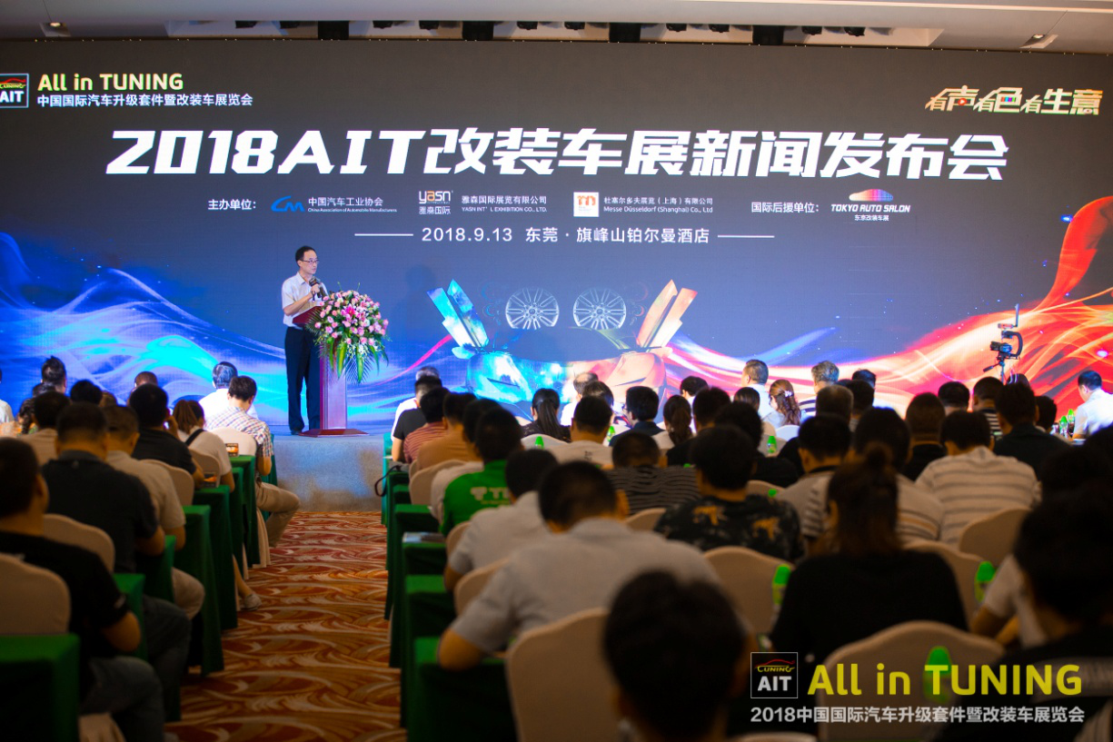 9月13日下午, “有声有色有生意” 2018中国国际汽车升级套件暨改装车展览会All In Tuning 2018(以下简称2018AIT改装车展)新闻发布会在展会举办地东莞·旗峰山铂尔曼酒店圆满召开。本届展会由中国汽车工业协会、雅森集团、杜塞尔多夫展览(上海)有限公司联合主办,来自东莞市政府领导、中国汽车工业协会领导、整车厂商、上百家知名改装企业代表、40余家改装行业主流媒体及电视台,近300多位嘉宾共同出席了本次发布会。