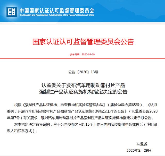 2020年5月29日,根据《认监委关于发布汽车用制动器衬片产品强制性产品认证实施机构指定决定的公告》(公告〔2020〕13号),中汽中心检测认证事业部中汽研华诚认证(天津)有限公司(以下简称“华诚认证”)获批指定认证机构,中汽研汽车检验中心(天津)有限公司(以下简称“天津汽车检测中心”)获批指定实验室。