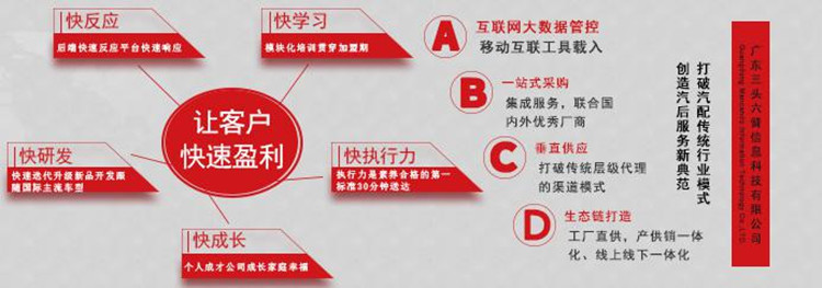 今天的三头六臂,真的是三头六臂啦!现在,与上千家国内外制造厂商深度战略合作,利用互联网思维,聚焦服务,专业极致产品优势,整合上游优质资源,开拓行业沉淀的市场资源,创造社区化服务模式,实现了汽车后市场最后一公里的服务理念,做到30分钟送货上门的快速服务体系,颠覆汽配现有模式,立志成为中国最优秀的汽车易损件集成服务商。