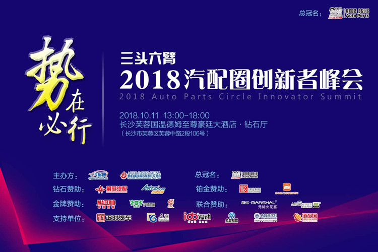 重磅!2018年10月11日,由汽配圈、第84届全国汽车配件交易会组委会共同主办,广东三头六臂信息科技有限公司独家冠名的“三头六臂·2018汽配圈创新者峰会”,将在长沙芙蓉国温德姆至尊豪廷大酒店钻石厅举办。