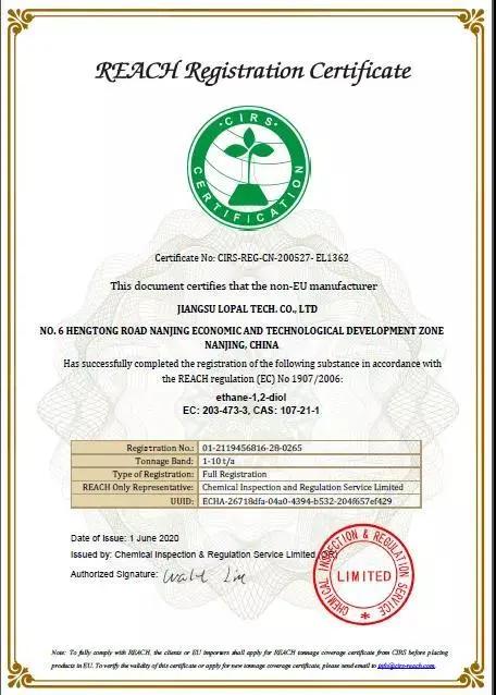 近日,龙蟠正式通过由欧盟化学品管理局主管的REACH注册认证。根据证书许可,龙蟠旗下的乙二醇型防冻液产品符合欧盟成员国出口相关法规要求,从而为龙蟠防冻液打开欧洲市场提供了权威背书。这也是龙蟠防冻液继成功出口马来西亚、新西兰等地区之后,为开拓全球布局迈出的重要一步。