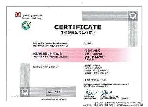 2020.6.5-7日,上海奥世管理体系认证有限公司审核专家对衡水众成摩擦材料有限公司进行IATF16949质量管理体系监督审核。审核结果:众成公司顺利通过2020年IATF16949监督审核。