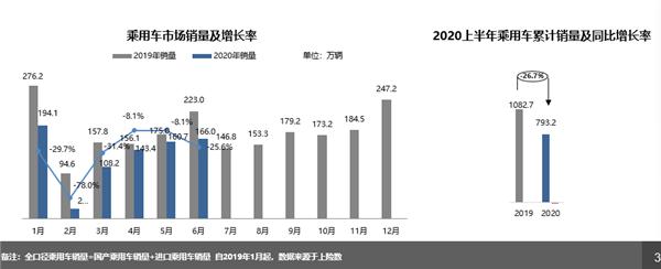 中国汽车流通协会8月3日发布全口径乘用车市场分析,数据显示2020年6月全口径乘用车销售166.0万辆,环比上升3.3%,同比下降25.6%,其中同比下降较多的原因主要是去年国五切国六政策销量增长,基数较大。2020年7月汽车消费指数为60.3,较上月略高。