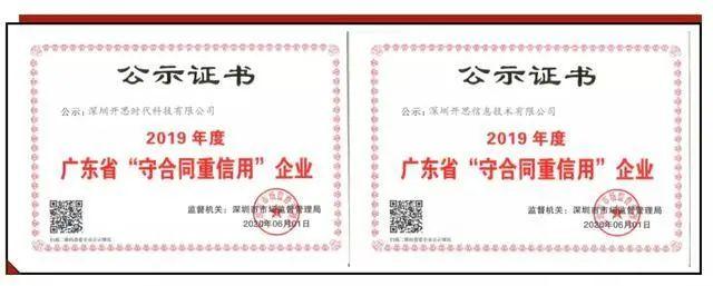 近日,深圳开思时代科技有限公司(简称“开思时代”)和深圳开思信息技术有限公司(简称“开思信息”)成功获评2019年度广东省“守合同重信用”企业。