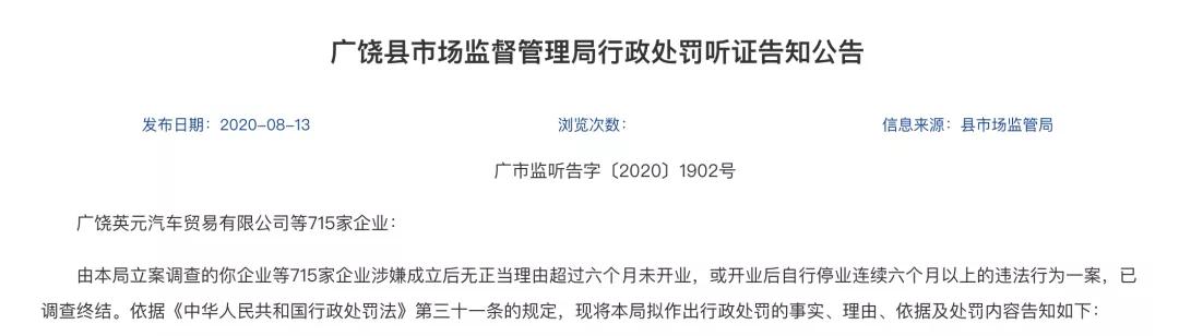 8月13日,广饶县市场监督管理局发布行政处罚听证告知公告,依法对715家企业拟吊销营业执照。