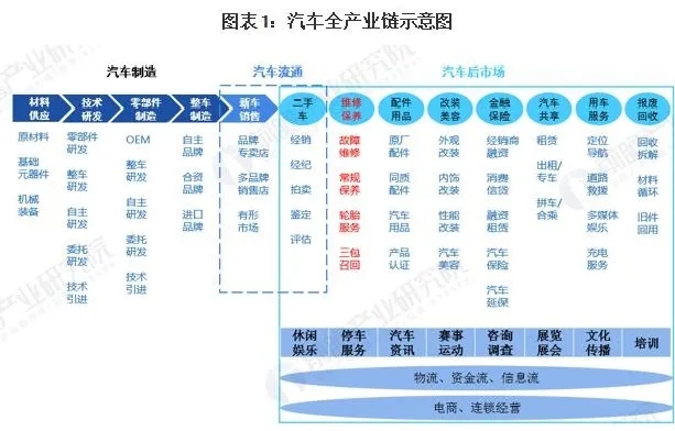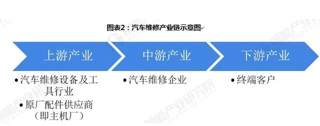 我国汽车全产业链由汽车制造、汽车流通和汽车后市场三个环节构成,汽车维修位于汽车后市场一环中。