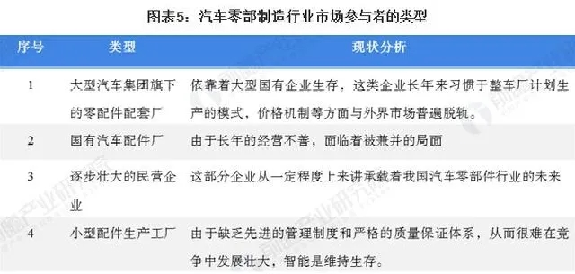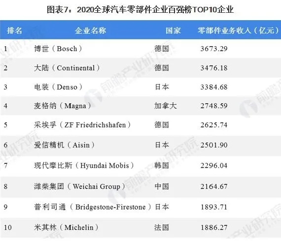 在2020年全球汽车零部件企业百强榜中,位列前五位的企业分别是德国博世、德国大陆、日本电装、加拿大麦格纳和德国采埃孚。其中中国共有11家企业入选,分别是潍柴集团、华域汽车、海纳川、均胜电子、宁德时代、中航汽车、广汽零部件、玉柴集团、中策橡胶、中信戴卡、法士特集团。在全球榜单中排名最高的中国企业潍柴集团以2164.67亿元的业务收入居于全球第八位。