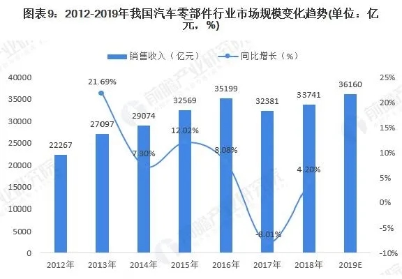 根据中国汽车工业协会统计数据,2012-2018年我国汽车零部件行业市场规模呈增长趋势,年均复合增长率达到7.17%。2018年,我国汽车零部件行业仍呈良好增长趋势。根据对规模以上13019家汽车零部件企业统计,全年累计主营业务收入3.37万亿元,同比增长4.20%,初步估算2019年我国汽车零部件行业市场规模约为36160亿元。