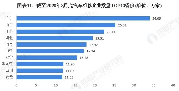 地域分布方面,企查猫数据显示,截至2020年8月底,汽车大省广东省的汽车维修企业数量全国排名第一,达34.05万家。其次为山东省,作为汽车维修大省,拥有蓝翔、万通等知名的汽修培训学校,汽车维修企业数量为25.31万家。江苏省排名第三,拥有22.41万家汽车维修企业。