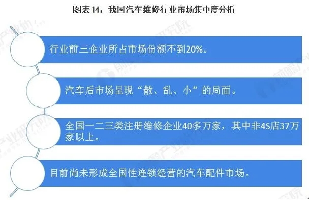 目前,我国汽车维修市场下游主要有五大终端渠道:汽车4S店、传统大中型维修厂、汽车维修路边店、汽车专项服务店、品牌快修美容装饰连锁店。