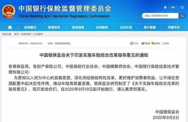 继7月车险综合改革征求意见、8月配套细则征求意见之后,银保监会官网于日前发布了《关于实施车险综合改革的指导意见》。将于2020年9月19日正式实施。预计改革实施后,短期内对于消费者可以做到"三个基本",即"价格基本上只降不升,保障基本上只增不减,服务基本上只优不差"。