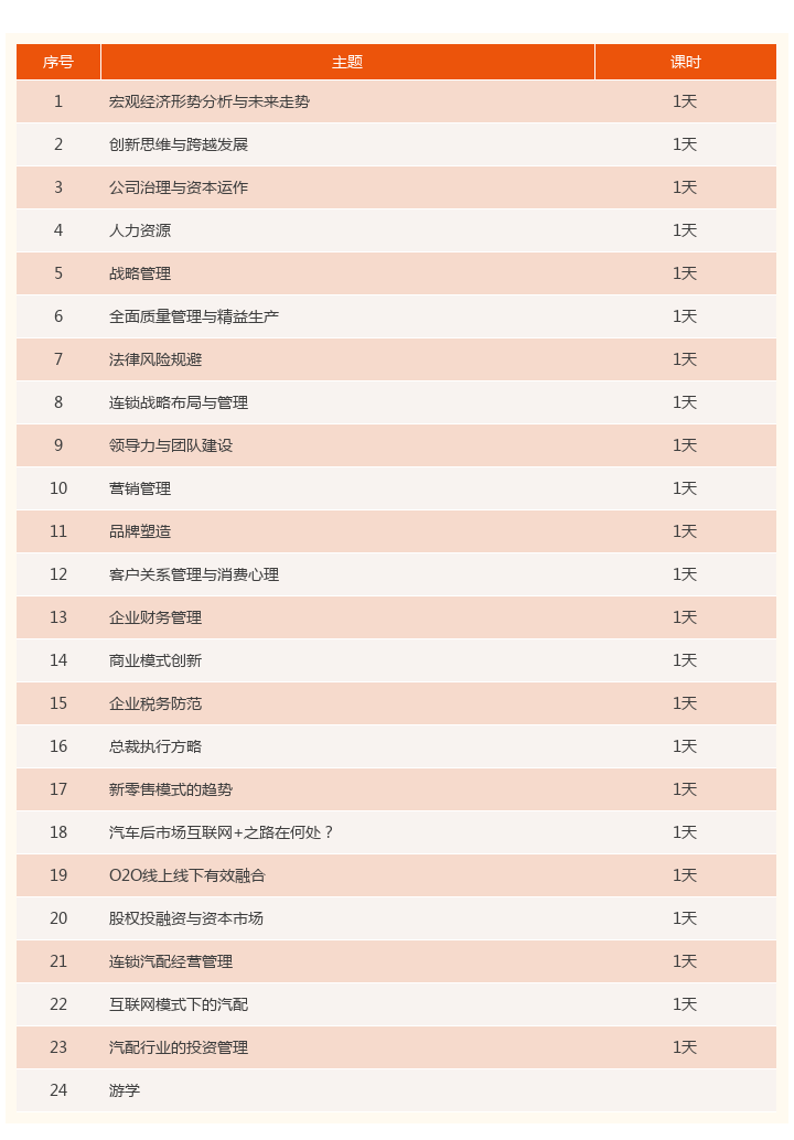 针对汽车产业后市场发展需要的定制化升级课程;紧紧围绕企业家迫切关注的难题深入展开,设计针对性、实战性、独创性的课程解决方案。培训采用模块式课堂研讨教学与现场教学专题讨论相结合的方式进行,专家将以典型案例和受训企业作为分析样本,引导学员通过所学知识,商业智慧转变成竞争能力。