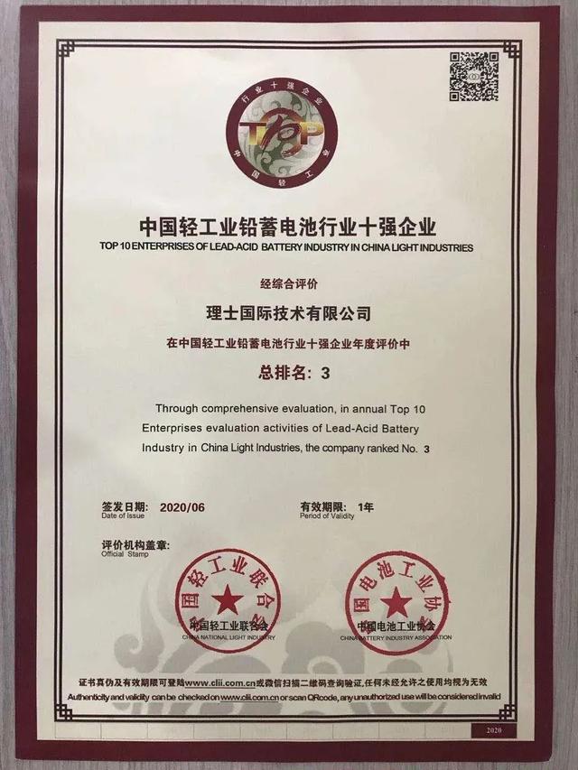 【理士国际入选“中国轻工业铅蓄电池行业十强企业”】