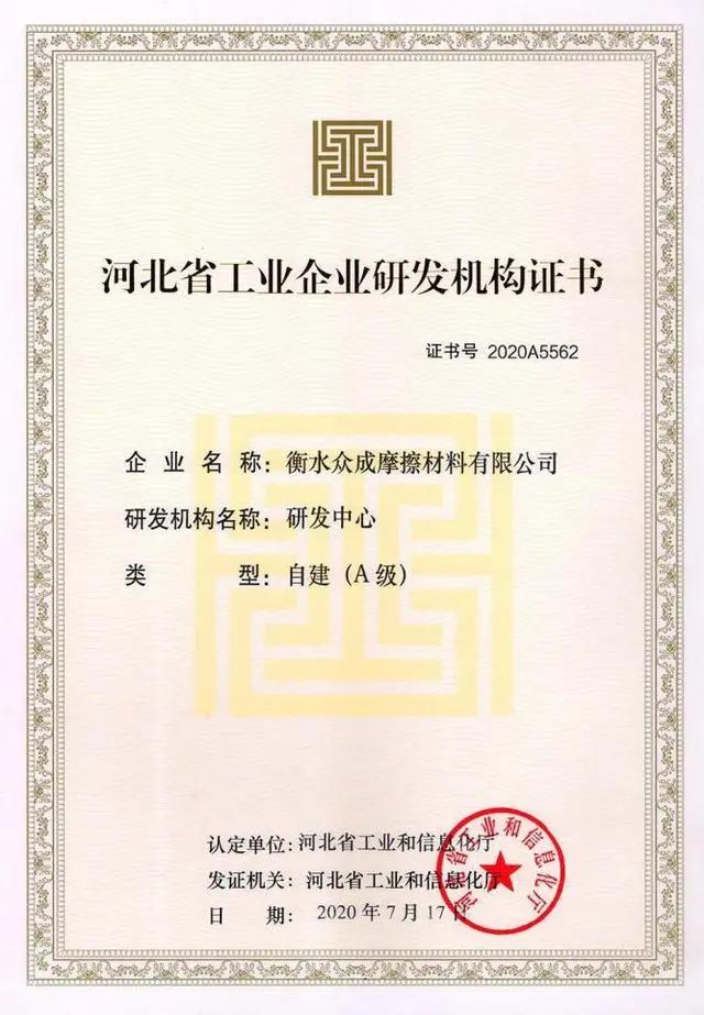 近日,经过严格的资料审核及认定,衡水众成摩擦材料有限公司被河北省工业和信息化厅授予"河北省工业企业研发机构(A级)证书"(证书号:2020A5562),标志着众成刹车片产品研发和检验能力再次得到了省级部门的认可。