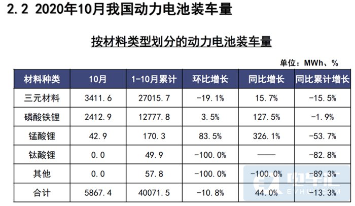 前10月,我国动力电池装车量累计40GWh,同比累计下降13.3%。其中三元电池装车量累计27GWh,占总装车量67.4%,同比累计下降15.5%;磷酸铁锂电池装车量累计12.8GWh,占总装车量31.9%,同比累计下降1.9%,已逐渐追平去年同期水平。