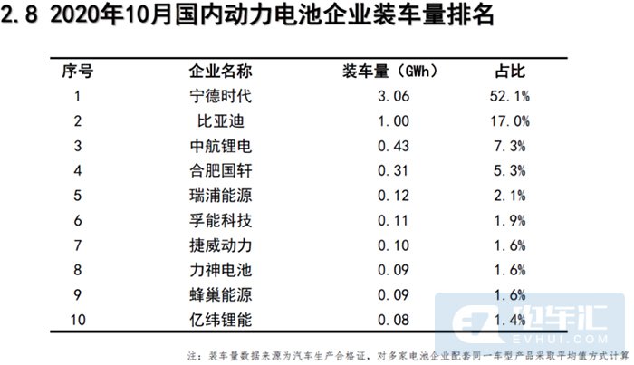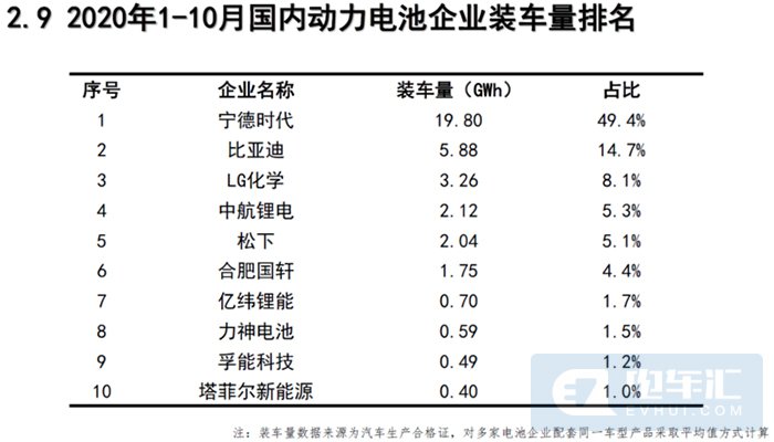1-10月,我国新能源汽车市场共计66家动力电池企业实现装车配套,较去年同期减少4家,排名前3家、前5家、前10家动力电池企业动力电池装车量分别为28.9GWh 、33.1GWh 和37GWh,占总装车量比分别为 72 。2%、82.6%和92.4%。