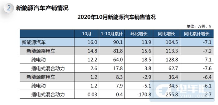 10月,新能源汽车产销双双超过16万辆,创10月单月历史新高,环比和同比继续保持快速增长,分别达到16.7万辆和16.0万辆,环比增长19.6%和13.9%,同比增长69.7%和104.5%。在新能源汽车主要品种中,与上月相比,插电式混合动力汽车产量有所下降,销量呈小幅增长,纯电动汽车产销均呈较快增长;与上年同期相比,纯电动和插电式混合动力汽车产销保持高速增长势头,纯电动汽车增速更为显著。