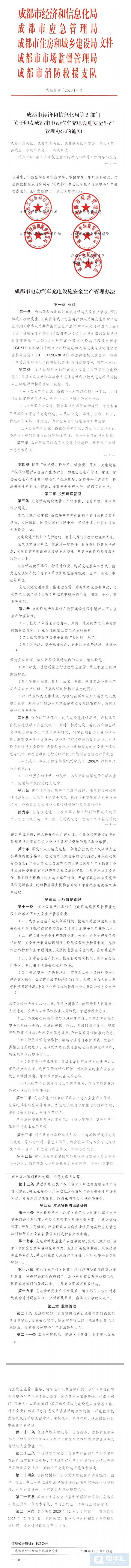 日前,成都市经济和信息化局等五部门印发《成都市电动汽车充电设施安全生产管理办法的通知》,管理办法自2020年12月9日起施行,有效期至2025年12月31日,将电动汽车充电设施分为自用、专用、公用三大类,明确充电设施的建设管理、运行管理、应急与事故的处理、监督管理等方面的权责管理。