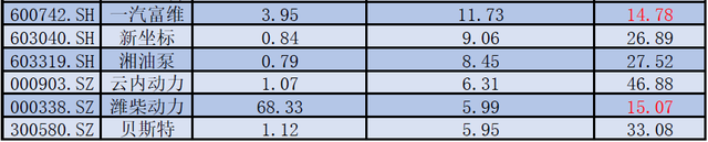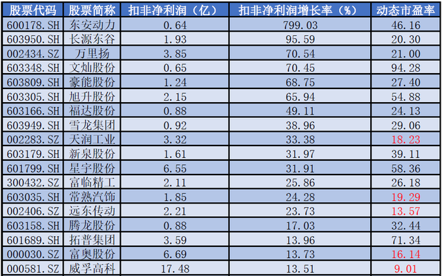 其中,东安动力、长源东谷、万里扬、文灿股份等扣非净利润增速位于前列,但值得注意的是东安动力和文灿股份等个股截止三季报净利润绝对值较低,仍小于1个亿;天润工业、常熟汽饰、远东传动、富奥股份、威孚高科等板块个股当前动态市盈率仍低于20倍,低估值个股随着板块整体估值抬升有望获资金青睐。