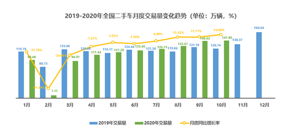 中国汽车流通协会数据显示,2020年10月,全国二手车市场交易量147.89万辆,交易量环比增长0.87%,月度同比增长16.68%。交易金额为905.72亿元。