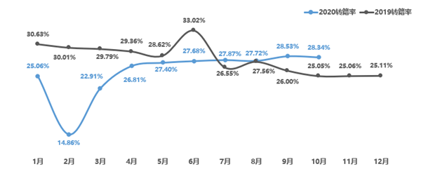 2020年10月全国转籍比例为28.34%,同期相比增长3.29个百分点。流通活跃前5个地区分别是北京、安徽、四川、浙江和黑龙江。1-10月二手车转籍总量为299.33万辆,转籍比例为27.06%,与去年同期相比下降了1.53个百分点。