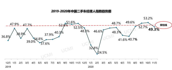 “中国二手车经理人指数”(UCMI)结果显示,11月份二手车经理人指数为49.3%,比10月份降低3.9个百分点,回落到荣枯线以下,二手车市场景气度降低。