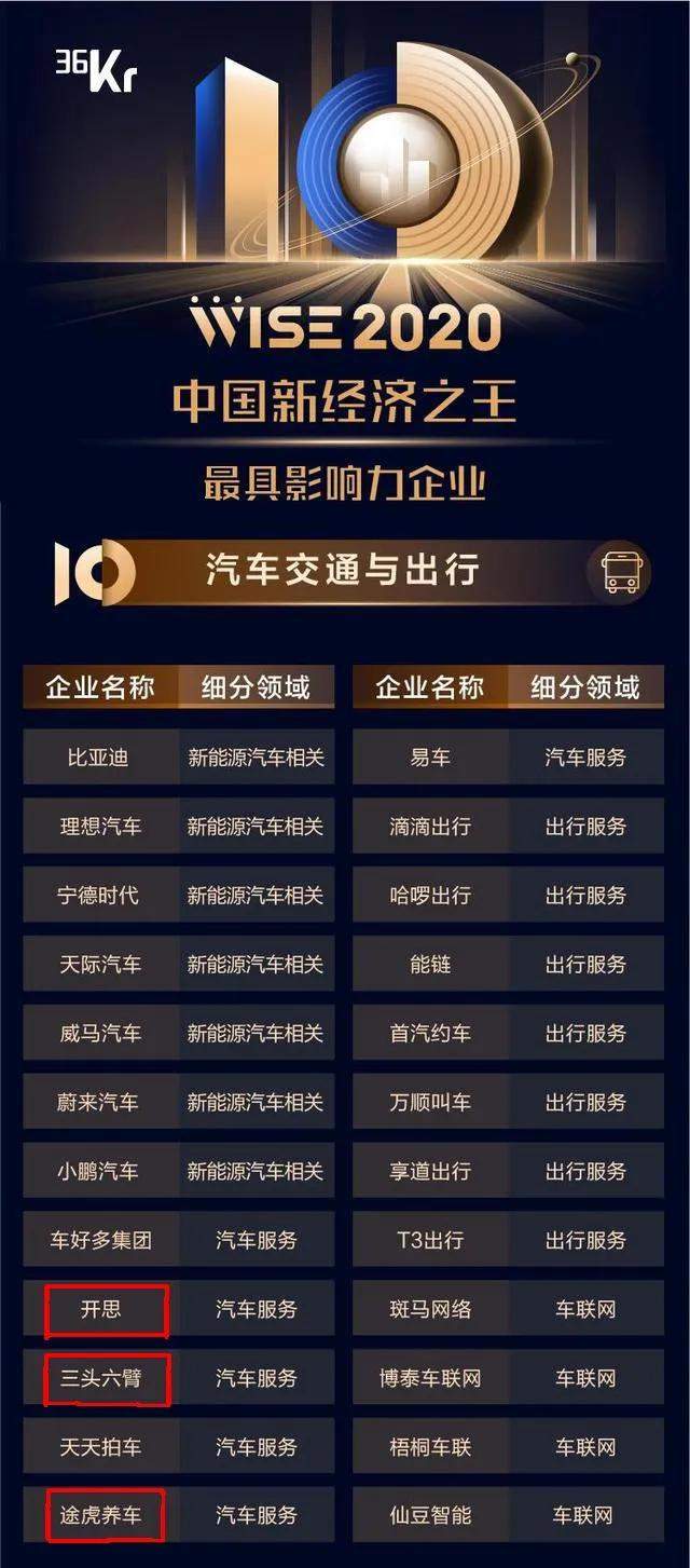 其中,在汽车交通与出行领域中,三头六臂(汽配供应链平台)、途虎养车(汽车养护电商平台)、开思(一站式汽配交易平台)凭借自己的能力,获得“WISE2020中国新经济之王最具影响力企业”的称号。