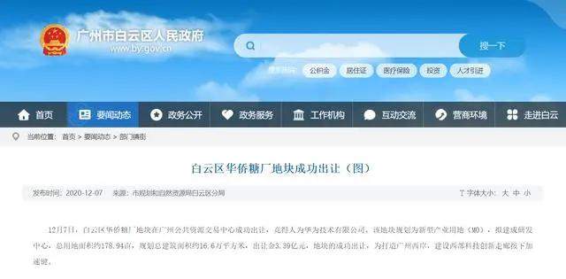 日前,从广州市白云区政府官网获悉,华为技术有限公司以3.39亿元成功竞得白云区华侨糖厂地块。据悉,华为未来或将在此处修建广州研发中心,用于智能汽车、云计算及物联网等技术领域的研发。