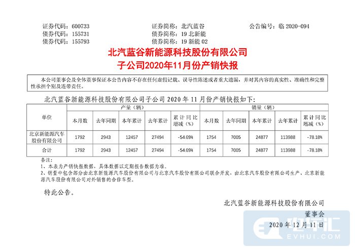 12月10日,北汽蓝谷披露子公司北汽新能源2020年11月份产销快报,当月产量为1792辆,当月销量为1754辆。