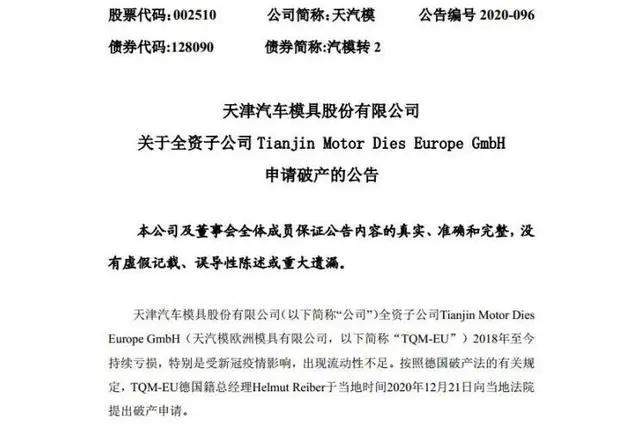日前,有外媒报道称,天津汽车模具股份有限公司(简称"天汽模")正式发布公告,旗下全资子公司Tianjin Motor Dies Europe GmbH(TQM-EU)正式提出破产申请。