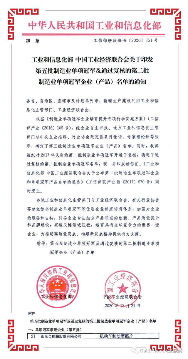 近日,国家工业和信息化部与中国工业经济联合会正式发布了关于第五批制造业单项冠军企业名单,山东金麒麟股份有限公司获“单项冠军示范企业”殊荣。