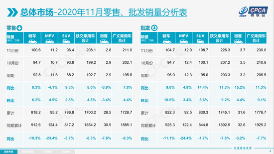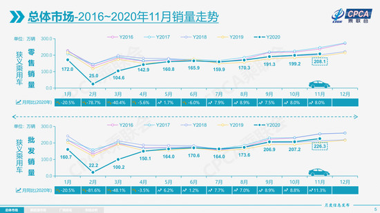 乘联会数据显示,11月,国内乘用车零售208.1万辆,同比增长8.0%,连续5个月保持了8%左右的增速;1-11月,累计零售1700.2万辆,同比下降8.3%,降幅比前10月收窄1.9个百分点。