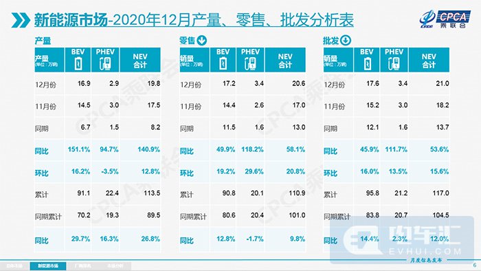1月11日,乘联会发布2020年12月及全年乘用车产销数据,其中新能源汽车在全年表现亮眼。数据显示,2020年新能源汽车全年的产量为113.5万辆,同比增长26.8%;2020年的新能源汽车零售量累积为110.9万辆,同比增长9.8%;2020年新能源车批发销量117万辆,同比增长12%。