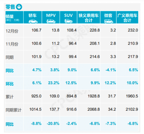 1-12月,我国乘用车零售累计达到1928.8万辆,同比下降6.8%,降幅较1-11月收窄1.5个百分点,较去年全年收窄0.6个百分点,体现行业的稳步回暖态势。